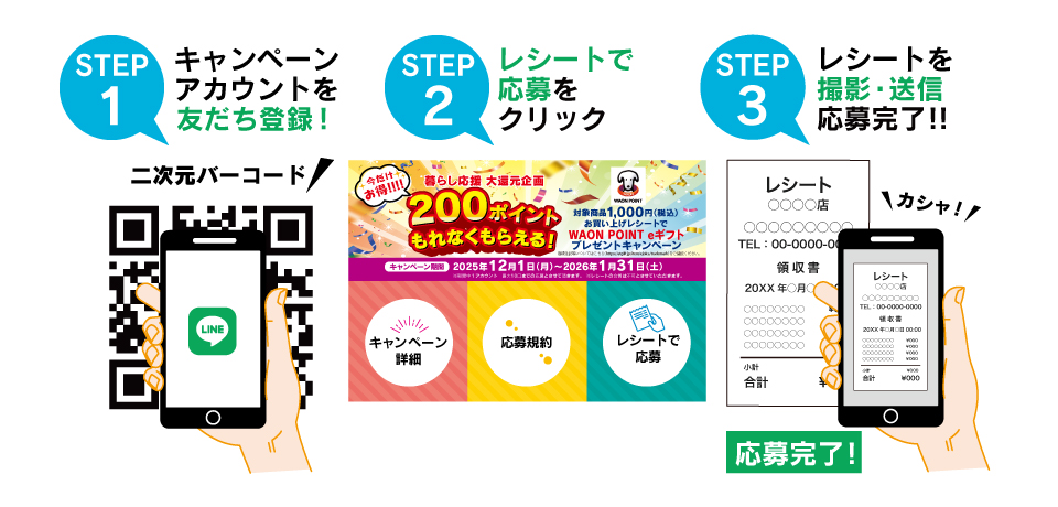 応募規約に同意の上、LINEトークルームに表示されるメッセージに従って、対象商品を1,000円(税込)以上ご購入された、レシート画像をアップロードすることでご応募いただけます。