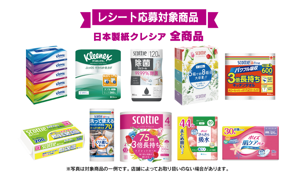 ・本キャンペーンは日本製紙クレシア株式会社による提供です。本キャンペーンについてのお問い合わせはイオン×クレシア キャンペーン事務局:0120-996-188【受付時間】10:00~17:00( 土・日・祝日・2025/12/29~2026/1/4を除く)までお願いいたします。