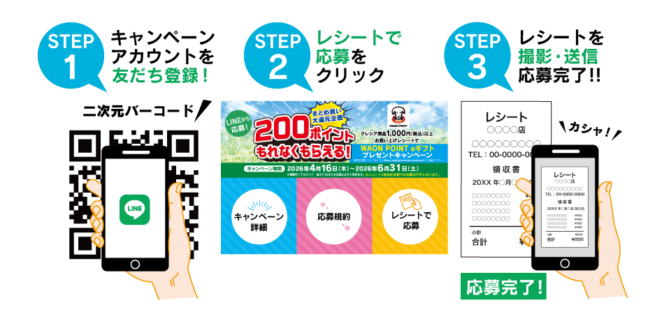 応募規約に同意の上、LINEトークルームに表示されるメッセージに従って、対象商品を1,000円(税込)以上ご購入された、レシート画像をアップロードすることでご応募いただけます。