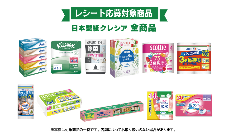 ・本キャンペーンは日本製紙クレシア株式会社による提供です。本キャンペーンについてのお問い合わせはイオン×クレシア キャンペーン事務局:0120-996-188【受付時間】10:00~17:00( 土・日・祝日・2025/12/29~2026/1/4を除く)までお願いいたします。