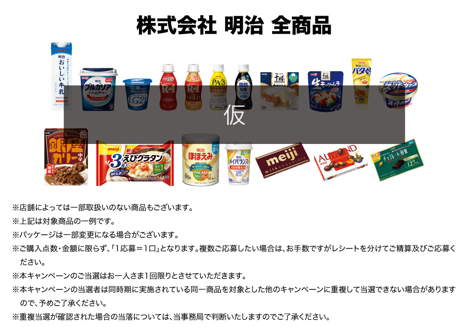 キャンペーン期間中に、対象店舗でお買上げいただいた明治商品を含むご希望の賞品の金額条件を満たすレシート(複数枚可)を1口として応募規約に同意の上、LINEトークルームに表示されるメッセージに従って、レシート画像をアップしてください。