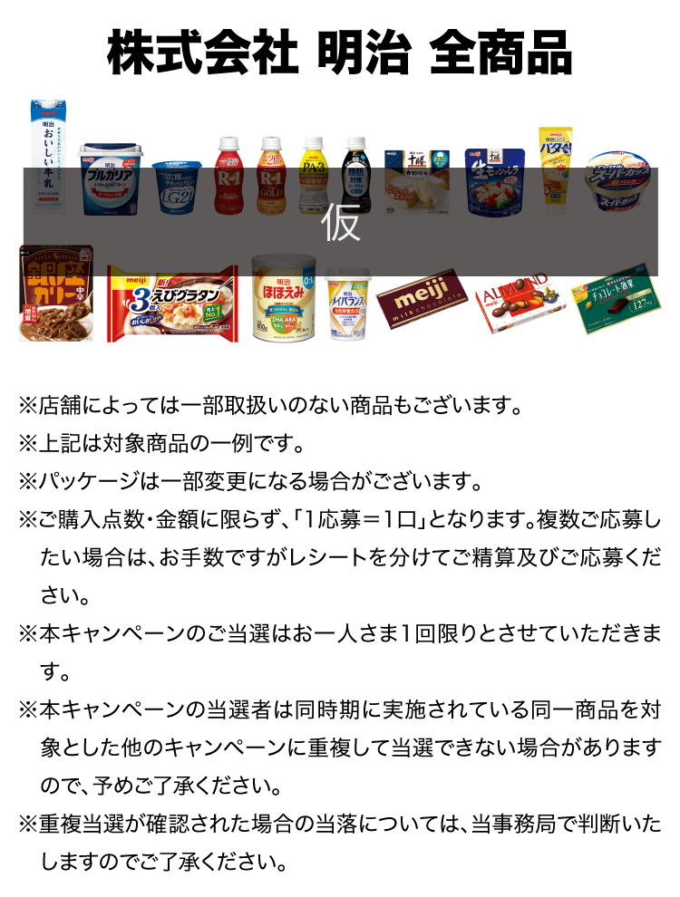 - ※本キャンペーンの当選者は同時期に実施されている同一商品を対象とした他のキャンペーンに重複して当選できない場合がありますので、予めご了承ください。また、当社を含む複数メーカーまたは流通企業との合同キャンペーンにおいて当選されている場合、重複して当選できない場合があります。