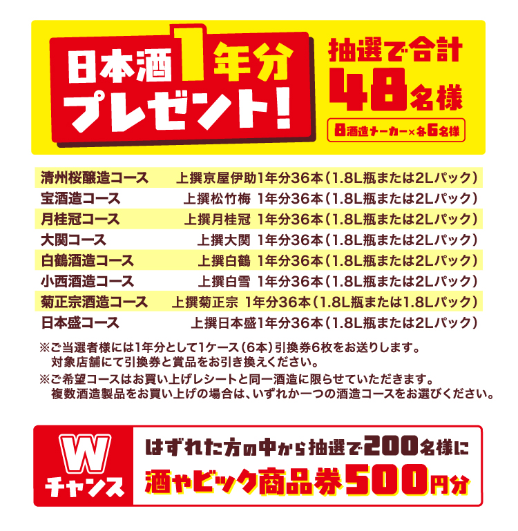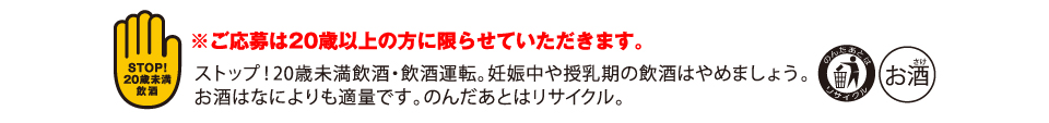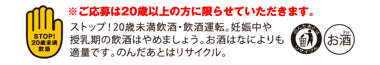 - ※酒ゃビックグループ、清洲桜醸造、宝酒造、月桂冠、大関、白鶴酒造、小西酒造、菊正宗酒造、日本盛の社員及び関係者は応募できません。