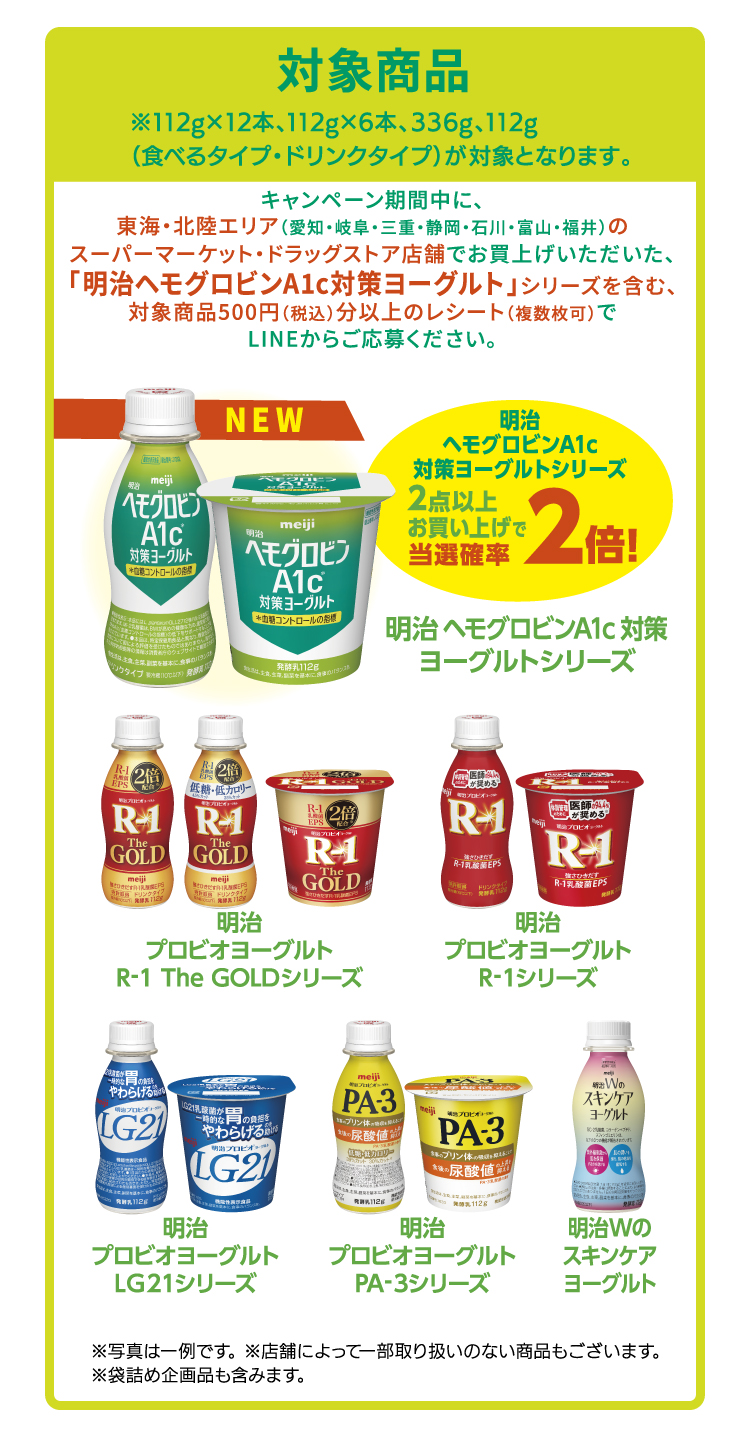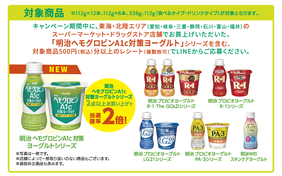 キャンペーン期間中に、対象店舗でお買上げいただいた「明治ヘモグロビンA1c対策ヨーグルト」シリーズを含む株式会社 明治の対象商品500円(税込)分以上のレシート(複数枚可)を1口として応募規約に同意の上、LINEトークルームに表示されるメッセージに従って、レシート画像をアップしてください。
