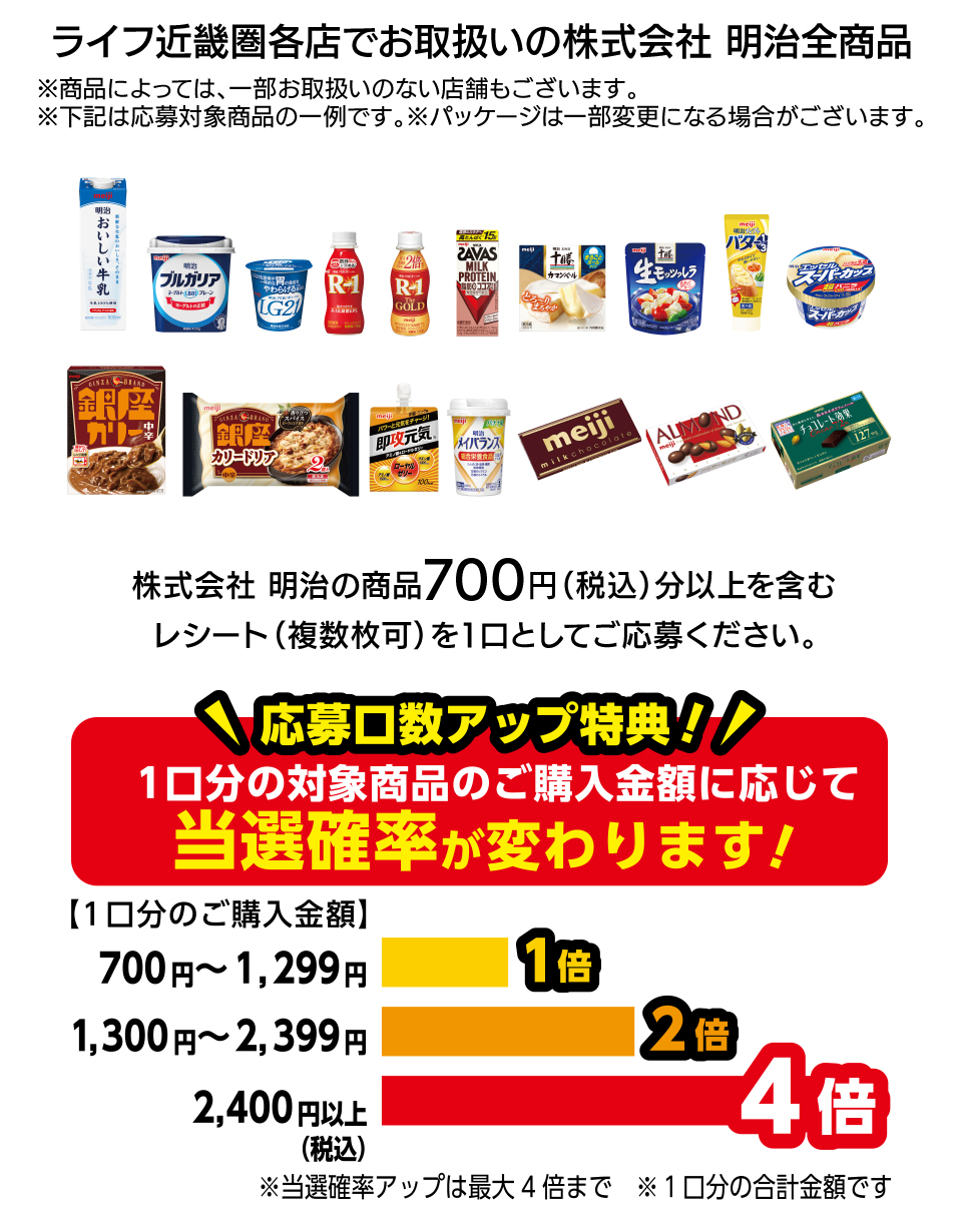 キャンペーン期間中に、対象店舗でお買上げいただいた株式会社 明治の商品700円(税込)分以上のレシート(複数枚可)を1口として応募規約に同意の上、LINEトークルームに表示されるメッセージに従って、レシート画像をアップしてください。