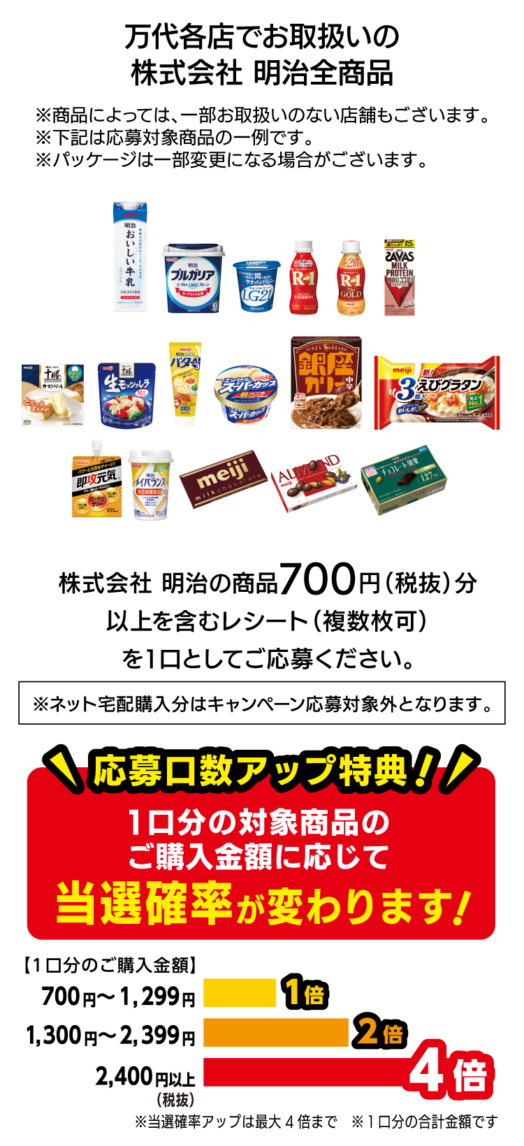 キャンペーン期間中に、対象店舗でお買上げいただいた株式会社 明治の商品700円(税抜)分以上のレシート(複数枚可)を1口として応募規約に同意の上、LINEトークルームに表示されるメッセージに従って、レシート画像をアップしてください。