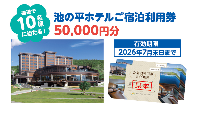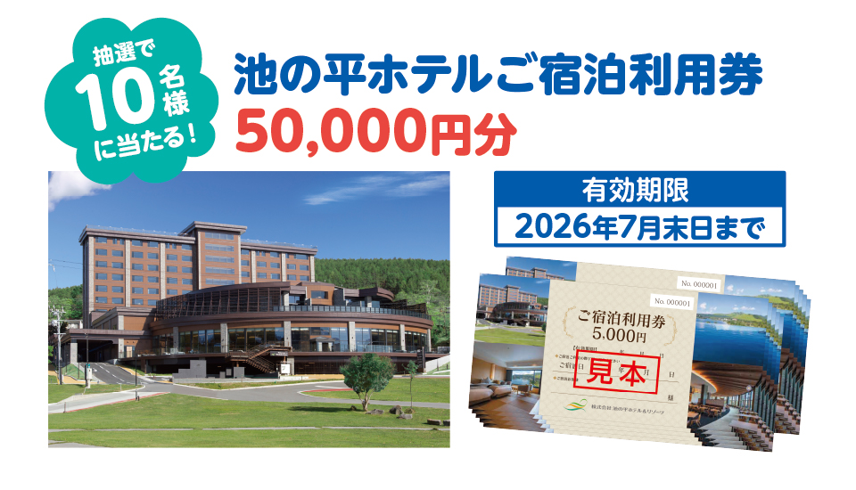 ●池の平ホテル ご宿泊利用券50,000円分:応募時にご登録いただいた送り先に賞品を発送いたします。