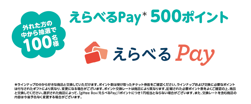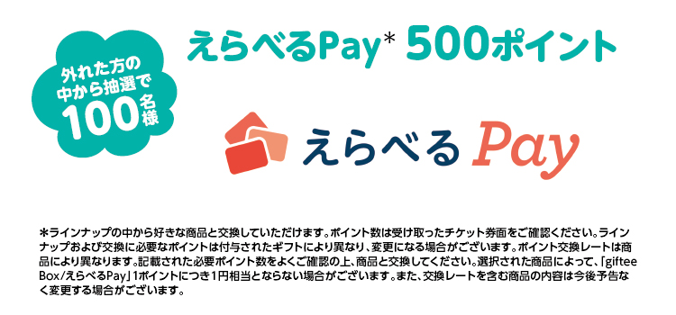 - えらべるPay500ポイント 上記賞品に外れた方の中から抽選で【100名様】