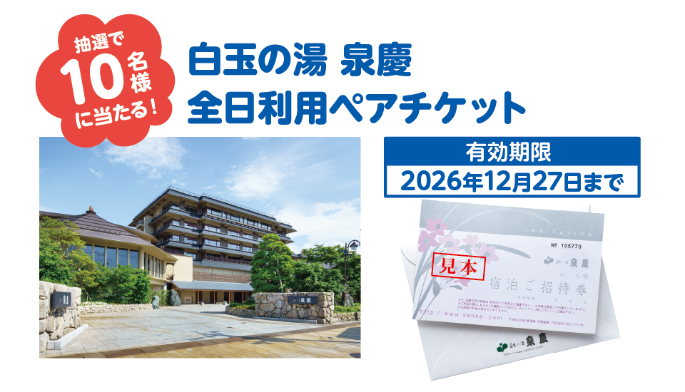●白玉の湯 泉慶 全日利用ペアチケット:応募時にご登録いただいた送り先に賞品を発送いたします。