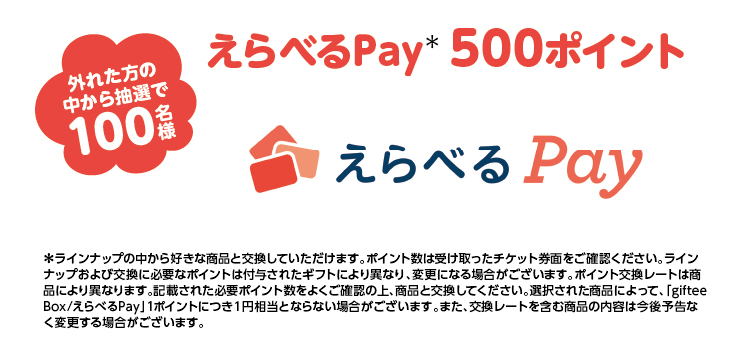 - えらべるPay500ポイント 上記賞品に外れた方の中から抽選で【100名様】
