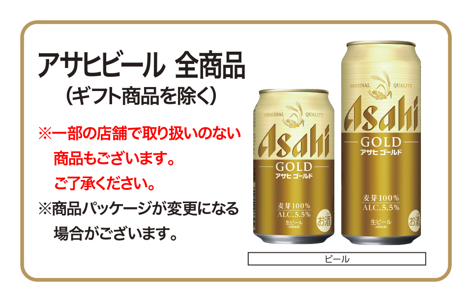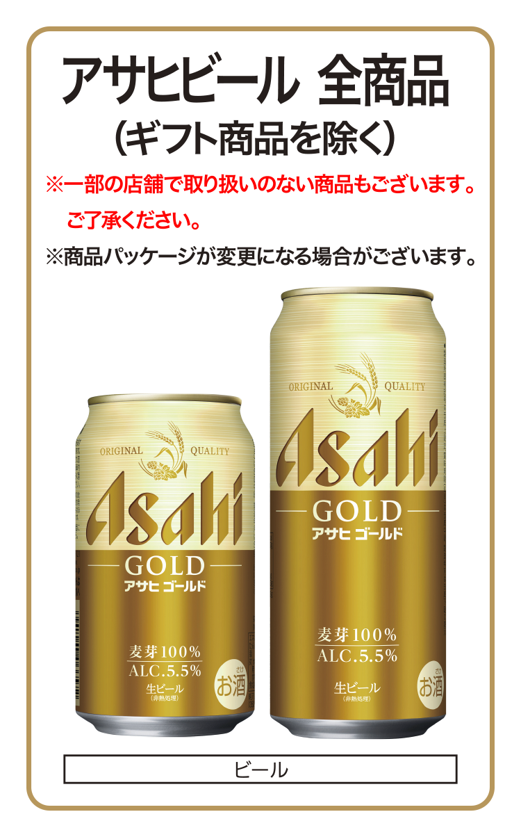 応募規約に同意の上、LINEトークルームに表示されるメッセージに従って、対象商品を含む2,700円(税込)分以上のレシート画像をアップロードすることでご応募いただけます。アサヒ ゴールド購入で当選確率2倍になります。※当選確率2倍=2口分の抽選権の付与
