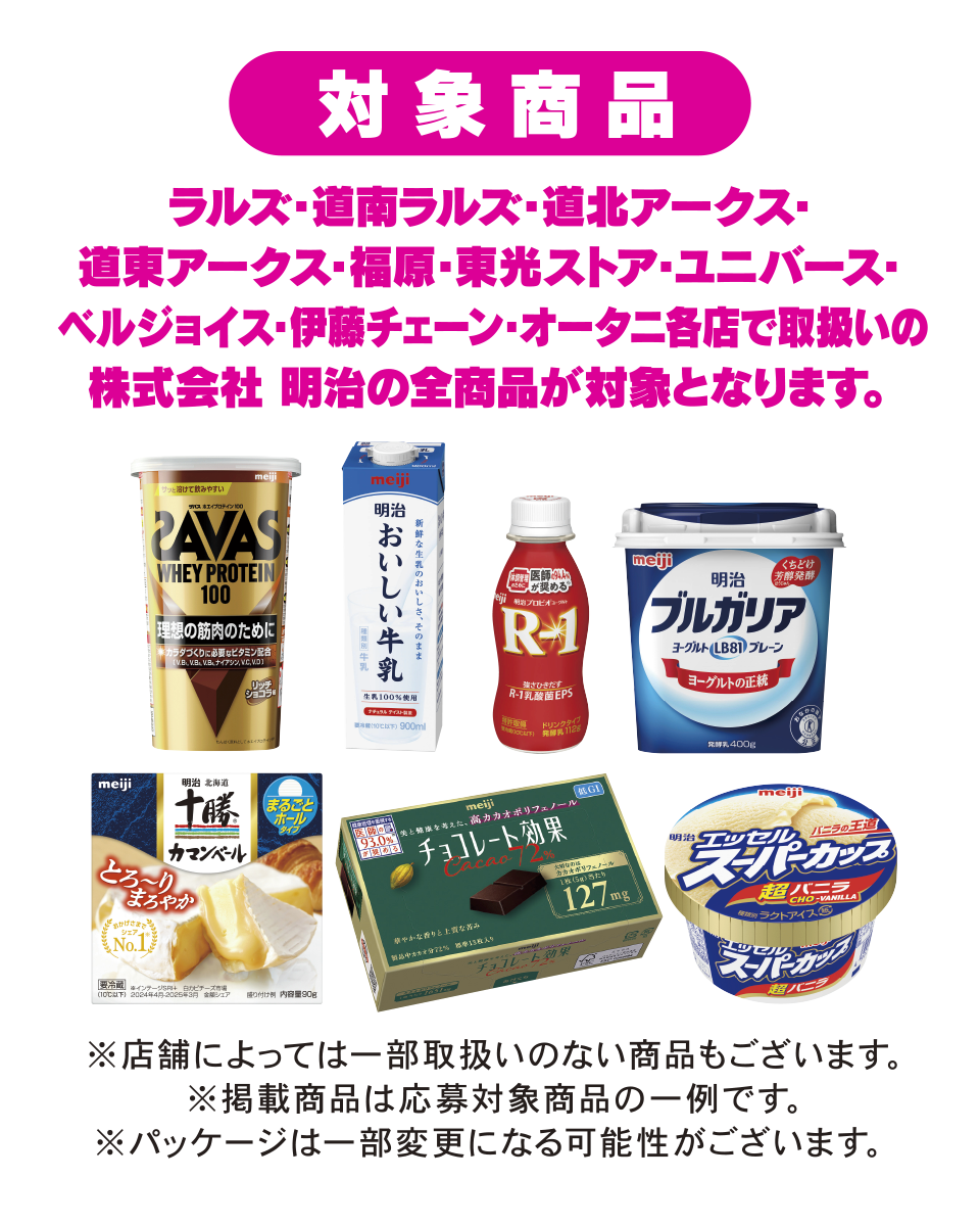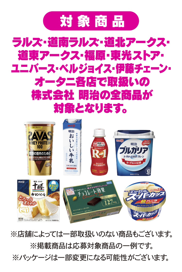 キャンペーン期間中に、ラルズ・道南ラルズ・道北アークス・道東アークス・福原・東光ストア・ユニバース・ベルジョイス・伊藤チェーン・オータニ各店でお買上げいただいた株式会社 明治の商品540円(税込)分以上のレシート(複数枚可)を1口として応募規約に同意の上、LINEトークルームに表示されるメッセージに従って、レシート画像をアップしてください。
