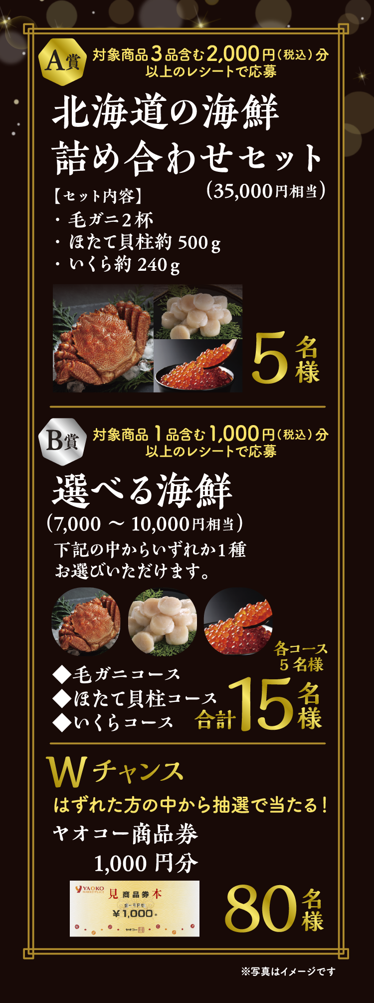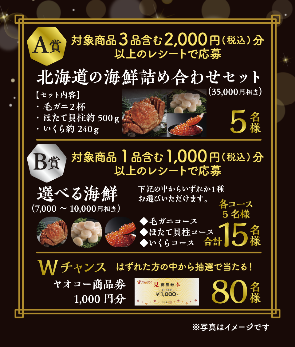 ※B賞の当選者は、毛ガニコース5名様、ほたて貝柱コース5名様、いくらコース5名様の合計15名様となります。