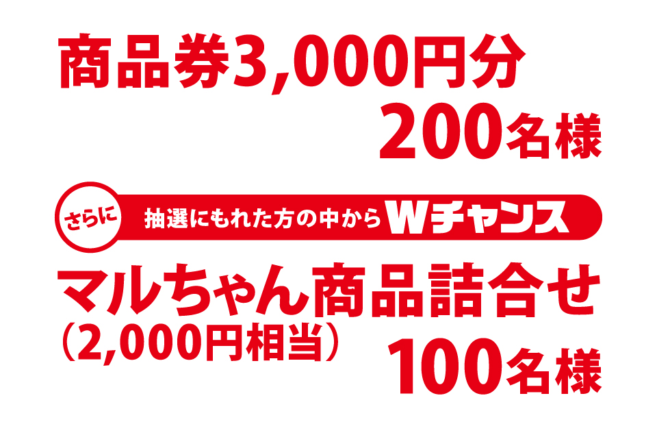 ご応募にはマルちゃん商品2点以上を含む、本体価格1,000円(税抜)以上ご購入の当店レシート画像の添付が必要となります。(レシートのいずれかに対象商品が含まれていれば、複数枚レシートでのご応募も可能です。)