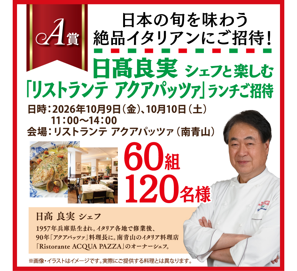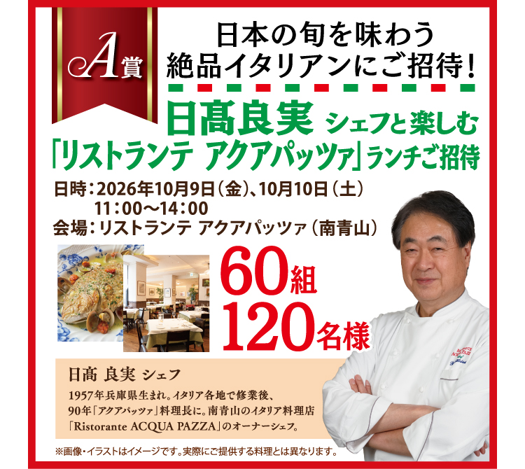- A賞:日髙良実シェフと楽しむ「リストランテ アクアパッツァ」ランチご招待 [60組120名様]